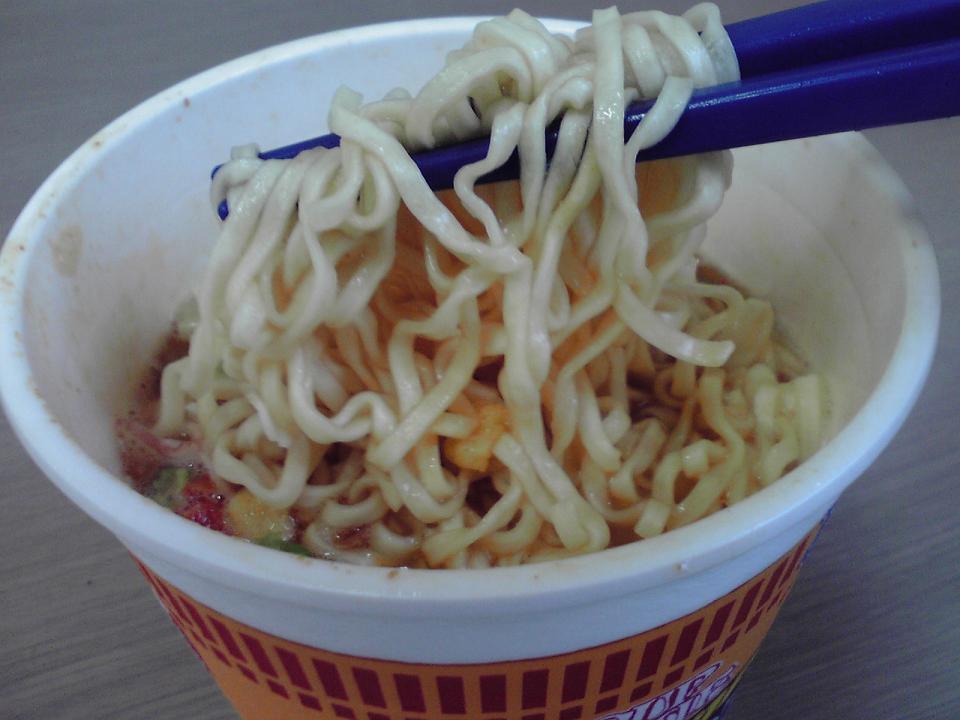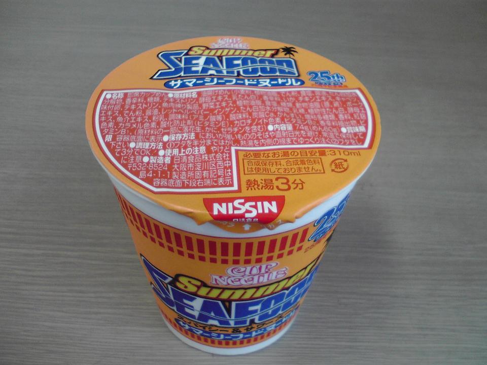 サマーシーフードヌードル 日清のカップヌードル 「サマーシーフードヌードル」 スープは普通のシーフードとあまり変わりませんが、そこに唐辛子の辛味が入り、夏バテを吹き飛ばすような味になっています。 少し酸味もありました。 具はカニかまがたくさん入っていました。 このカップヌードルは25周年を迎えたことを記念して出されたものらしいです。 2009.9.3